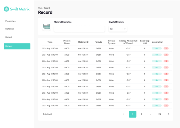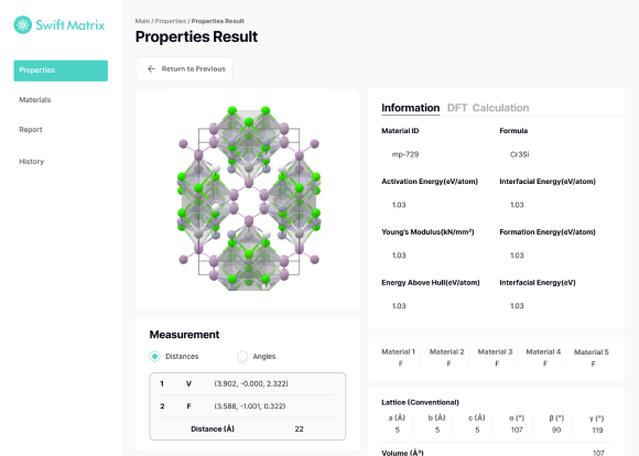 Swift Matrix is a comprehensive web solution that provides material property analysis reports by utilizing data on material properties (heat resistance, density, strength, etc.) and AI-based property effect inference to rapidly and accurately discover new materials such as batteries.